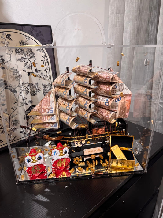 🎁 帆船永生花鈔票禮盒|發財獅子$500黑色船