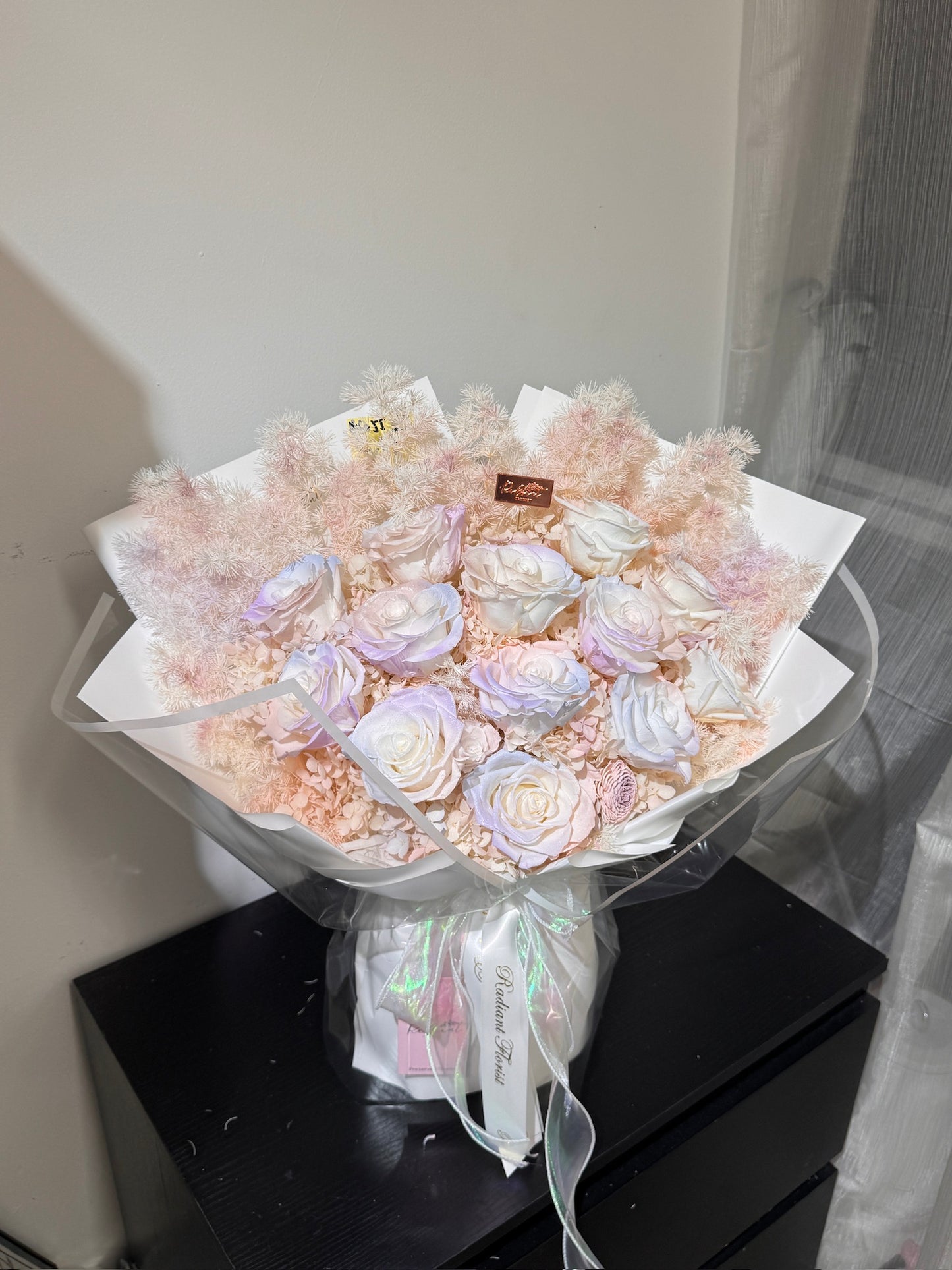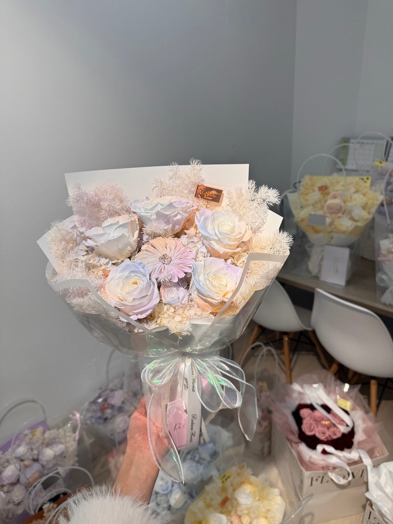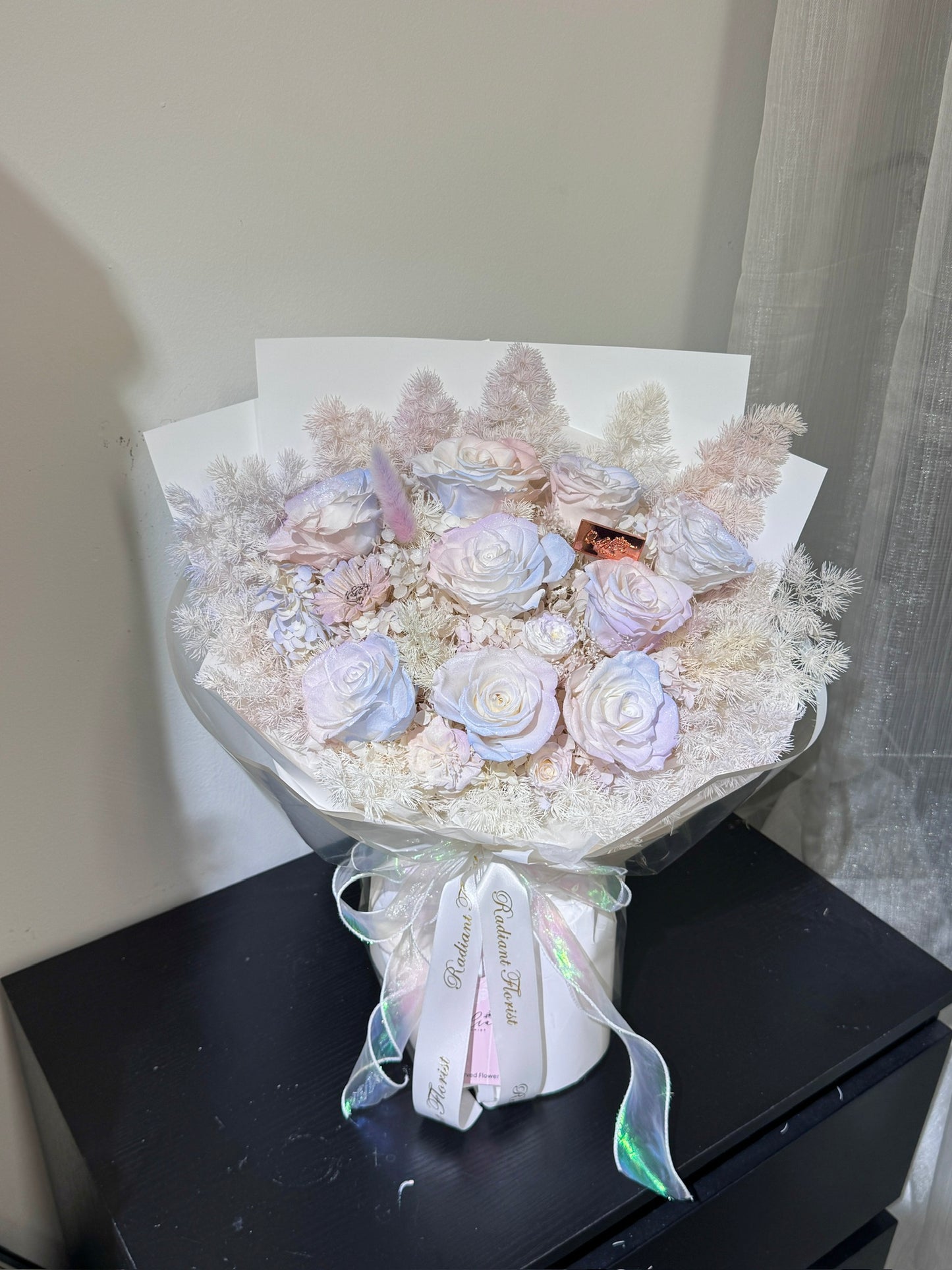 這款花束用的是鑽石玫瑰,花瓣上有超級閃的閃粉,比起平時嘅珠光玫瑰更加閃!