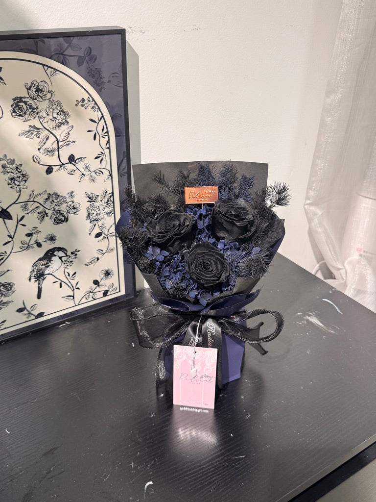 以濃郁的午夜藍繡球與黑玫瑰為主角,點綴蓬萊松的細膩線條,打造如深海般靜謐而深邃的花藝作品。給那些在黑暗中仍能看見星辰的人
